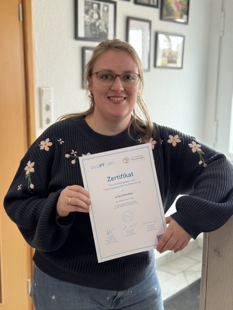 Stolz präsentiert Anika Behnken eine frisch gedruckte Urkunde, die sie seit dem 8. Februar 2026 als Traumapädadagogin und traumazentrierte Fachberaterin ausweist. Ihre Weiterbildung wurde durchgeführt vom Zentrum für Traumpädadogik Sturmfänger mit Sitz in Ihlow. Zertifiziert wurde sie durch die Deutschsprachige Gesellschaft für Psychotraumatologie (DeGPT) und dem Fachverband Traumapädagogik e.V. (FVTP). Von Januar 2024 bis Februar 2026 absolvierte Anika insgesamt neun Module mit verschiedenen Schwerpunkten, angefangen bei den Grundlagen der Psychotraumatologie bis hin zur Traumapädagogik und traumazentrierten Fachberatung. In Intervisionsgruppen wurden die Weiterbildungsinhalte vertieft und supervisorisch aufgearbeitet. Zum Programm gehörten zudem Projekt- und Fallvorstellungen in mündlicher und schriftlicher Form.
